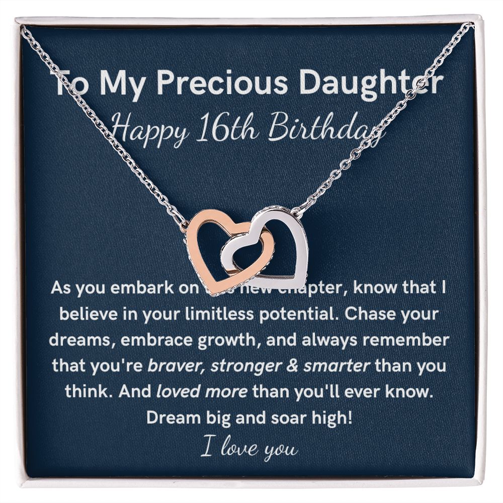 Surprise the birthday girl with this stunning Silver Heart Necklace on this special occasion! The kind of gift she will love and treasure forever. Give your daughter on her 16th birthday the gift that symbolizes your never-ending love. Featuring two lovely hearts embellished with cubic zirconia crystals, this Interlocking Hearts necklace is the perfect accessory for everyday wear. A special birthday gift, that will make sure to dazzle your special daughter by gifting them this stunning necklace.